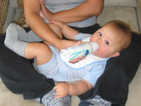 Jordan enjoys a bottle of milk after his morning nap. With a hand resting on his knee, he looks so relaxed on Mommy's lap. |